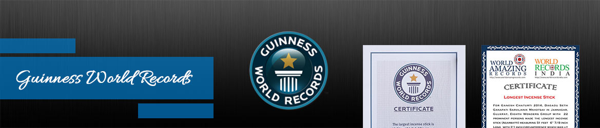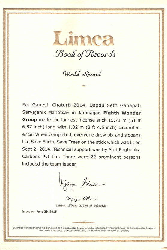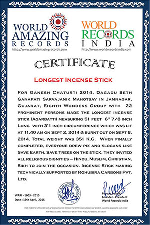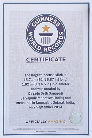 For the largest incense stick of the world 15.71 m long and 1.02 m in diameter by Dagdu seth Ganpati sarvajanik Mahotsav.